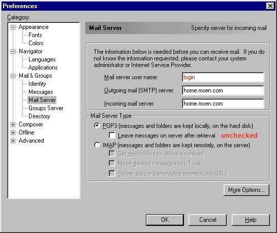 Now, fill in the fields. Red information is account specific. Black information is standard across all MsenLite accounts. The login should not contain a leading L. The "Mail Server Type" is POP3, and the "Leave Messages" should be unchecked.